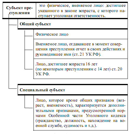 Субъект преступления - лицо, совершившее преступление. Субъектом преступления может быть только то лицо, на которое возможно возложение обязанности отвечать за содеянное, то есть лицо, достигшее указанного в законе возраста (ст. 20 УК) и вменяемое (ст. 21 УК). Есть в уголовном праве понятие специального субъекта, то есть лица, обладающего, помимо названных общих признаков (возраст, вменяемость), специальными признаками, указанными в законе. Так, исполнителем преступления, предусмотренного ч. 1 ст. 285 УК (злоупотребление должностными полномочиями), может быть только должностное лицо.