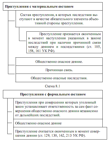 Подразделение составов на материальные, формальные и усеченные имеет в своей основе характерные особенности процесса развития любой, а следовательно, и общественно опасной деятельности человека, которая может быть поэтому разложена на ряд последовательных этапов: приготовление к действию, само действие и, наконец, достижение (причинение) результата. Если законодатель таким образом сконструирует состав преступления, что в число характеризующих его признаков будет входить не только деяние, но и вызванные им общественно опасные последствия, то такой состав имеет материальный характер. Так сконструированы составы убийства, кражи и многих других преступлений. Напротив, если законодатель ограничится описанием признаков деяния и тем самым выведет последствия за пределы состава преступления, то состав приобретает формальный характер. В этом случае для наличия оконченного преступления достаточно лишь полного выполнения соответствующего действия. Формальными составами являются составы клеветы, дезертирства, и некоторые другие.