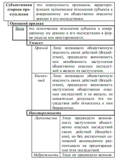 Субъективная сторона преступления, характеризуется виной лица, совершившего преступление. Вина может быть умышленной (ст. 25 УК) или неосторожной (ст. 26 УК). Наряду с этим УК предусматривает ответственность за преступление, совершенное с двумя формами вины (ст. 27 УК). К субъективной стороне преступления относятся также мотив и цель преступления.