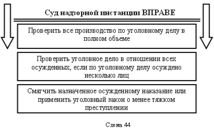 При рассмотрении уголовного дела в порядке надзора суд не связан доводами надзорных жалобы или представления и вправе проверить все производство по уголовному делу в полном объеме. В случае, если по уголовному делу осуждено несколько лиц, а надзорные жалоба или представление принесены только одним или в отношении некоторых из них, то суд вправе проверить уголовное дело в отношении всех осужденных. Суд при рассмотрении уголовного дела в порядке надзора может смягчить назначенное осужденному наказание или применить уголовный закон о менее тяжком преступлении. В случае, когда по уголовному делу осуждено или оправдано несколько подсудимых, суд не имеет права отменить приговор, определение или постановление в отношении тех оправданных или осужденных, в отношении которых надзорные жалоба или представление не внесены, если отмена приговора, определения или постановления ухудшает их положение. Указания суда надзорной инстанции обязательны при повторном рассмотрении данного уголовного дела судом нижестоящей судебной инстанции.