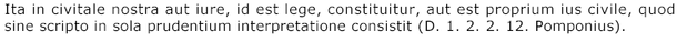 В этих словах Помпония подчеркнута творческая роль римского толкования законов и его значение как источника права. Так, путем толкования ХII таблиц были выработаны институты эмансипации (освобождения) детей от отцовской власти, наследования по закону и др. Путем толкования развилась большая часть институтов цивильного права. Древнее толкование III — II вв. до н.э. строго держалось словесной формы, в которую облекались законы или сделки. Цицерон рисует это состояние и метод словами — veteres verba tenuerunt — древние держались за слова (pro Murena, 11), подчеркивая консерватизм методов старого толкования.