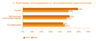 Более половины опрошенных российских компаний (59%) указали, что стали жертвами как минимум одного экономического преступления за последние два года. Это на 10% выше показателя, обзора 2005 года.