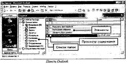 Задачи - содержит список дел, которые необходимо выполнить. Их можно расставлять по приоритетам и поручать другим исполнителям. Здесь можно не только сформулировать задание, но и послать указание по электронной почте исполнителю. При приеме такого поручения папка "Задачи" каждого исполнителя
