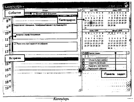 Календарь - контролирует расписание и планирует встречи с другими людьми. Можно просмотреть отчеты, обзоры за день, неделю, месяц. Кроме того, новая функция (Автодата) позволяет вводить дату на разговорном языке (например, в следующую среду) и получать ее преобразование - 7 июля 1999 г. Outlook может напомнить о предстоящей встрече звуковым сигналом. При организации собрания, совещания "Планировщик собрания" выберет наиболее удобное для всех время и известит в нужный момент об этом мероприятии.
