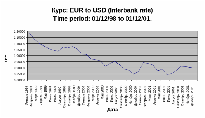 В период с июля по октябрь курс стабилизировался, но это была непродолжительная передышка, которая завершилась падением до 0,85 в октябре 2000 года. Столь значительное падение объяснялось специалистами Европейской комиссии не столько слабостью ЕВРО, сколько исключительным усилением доллара. Высказывались предположения, что как только экономическое положение в ключевых странах “зоны ЕВРО” (Германия и Франция), начнет улучшаться, позиции ЕВРО относительно доллара сразу усилятся. Усиления не произошло, но с середины 2000 года курс зафиксировался в коридоре от 0,85 до 0,95. Качания “валютного маятника” объясняются в основном усилением нервозности на валютном рынке (как это отмечалось на разных этапах развития кризиса в Юго-Восточной Азии).
