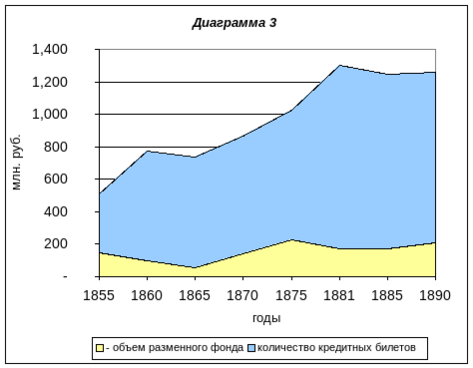 Кстати именно на этот период пришлось создание Государственного банка России, преемником которого считает себя нынешний ЦБ (см. историческую справку на сайте ЦБ в Интернете по адресу www.cbr.ru). По уставу банк учреждался "для оживления торговых оборотов и упрочения денежной кредитной системы" [8], на что ему из казны было положено 15 млн. рублей. Результаты такого “упрочения” хорошо видны на диаграмме 3.