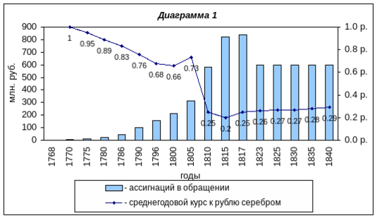 Вне зависимости от того, монарх какого государства принимал рано или поздно решение просто и быстро напечатать необходимое (скорее – желаемое) ему количество денег, вместо того, чтобы долго и кропотливо путем улучшения условий для жизни и ведения бизнеса своих подданных добиться повышения объема налогов, собираемых в казну, инфляция в этом государстве быстро “съедала” все сбережения и расстраивала денежное обращение. Вот только в России размах эмиссионного дела в первые же годы начала выпуска ассигнаций был широчайшим, что свойственно не столько особенностям русской души (Екатерина II была немкой), сколько безответственности верховной власти огромного по своей территории государства. Покрывая огромный дефицит бюджета выпусками ассигнаций российское правительство каждый раз официально сообщало, что эмиссия бумажных денег делалась исключительно в интересах развития народного хозяйства. В первое время появление в обороте бумажных денежных знаков (а в первые год-два они свободно разменивались на серебро по курсу 1:1) действительно способствовало облегчению торговых оборотов (облегчению в прямом смысле, ибо одна тысяча рублей медной монетою весила в то время 1024 кг), но в результате безудержной эмиссии ассигнаций безо всякого обеспечения реальными активами денежные платежи по ним были приостановлены, сами ассигнации были признаны законными платежными средствами, а их неофициальный курс стал стремительно снижаться (см. диаграмму 1).