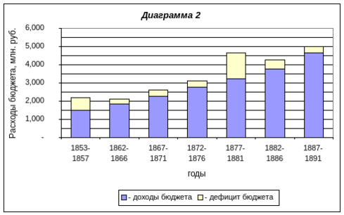 О следующем периоде российской истории доктор экономических наук профессор Г.Б. Поляк лаконично пишет: “… в результате войн Николая I и особенно Крымской войны и последовавшего в связи с этим расширением бумажной эмиссии денежное обращение вновь расстроилось. Размен кредитных билетов на серебро был прекращен, и до денежной реформы 1895-97 годов в обращении находились лишь бумажные деньги” [8]. На языке цифр этот период выглядел следующим образом: диаграмма 2 показывает параметры (доходы, расходы, дефицит) государственного бюджета Российской империи в 1853 – 1891 годах, диаграмма 3 – отношение разменного фонда к количеству кредитных билетов.