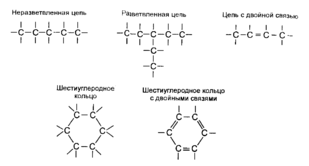 Рис. 1. Способы соединения атомов углерода друг с другом Черточки со свободными концами при каждом атоме углерода показывают, что он может образовывать связи с атомами других элементов (обычно это водород, кислород, азот, сера)