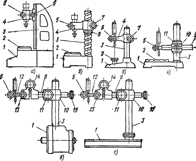 Область применения индикаторов расширяется благодаря использованию приспособлений. Струбцина для установки на валы (рис. 6,а) имеет скобу 3 с губкой 2, которая перемещается винтом 1. К струбцине привинчивается стержень 4 с хомутом 5 для крепления державки 6 с индикатором 7. Прямой (рис. 6, б) и угловой (рис. 6, б) рычаги применяют при измерениях в труднодоступных местах. Рычаги 9 под действием измерительного стержня 12 индикатора поворачиваются вокруг оси 10 кронштейнов 11, прикрепленных к гильзе индикатора, и упираются сферическими наконечниками 8 в поверхность изделия.