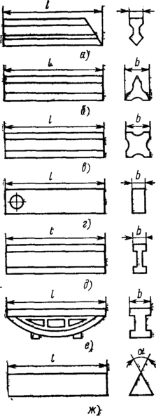 5) Линейки поверочные изготовляются следующих типов: ЛД — лекальные с двухсторонним скосом (рис. 7, а); ЛТ—лекальные трехгранные (рис. 7,6); ЛЧ—лекальные четырехгранные (рис. 7, в); ШП — с широкой рабочей поверхностью прямоугольного сечения (рис. 7, г); ШД—с широкой рабочей поверхностью двухтаврового сечения (рис. 7,и); ШМ—с широкой рабочей поверхностью, мостики (рис. 7, е); УТ—угловые трехгранные (рис. 7, ж).