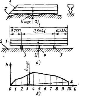 линеек типа ШД 630Х4—4000 X 30 мм; линеек типа ШМ 400 X 50 — 3000 X 110 мм. Линейки выпускаются трех классов точности: 0, 1 и 2. При контроле прямолинейности методом «линейных отклонений» рис.8, б линейку 1 укладывают рабочей поверхностью на две одинаковые концевые меры 3 размером b0, установленные на проверяемой поверхности 2. Для уменьшения погрешностей измерений из-за прогибов линейки опоры располагают в точках наименьшего прогиба (точки Эри), которые отмечены рисками на боковой поверхности линеек, Точки Эри лежат на расстоянии 0,233l от концов линейки. На боковой поверхности линейки наносят мелом отметки на расстояниях, равных 0,1l. В отмеченных точках 0, 1, 2, ..., 10 измеряют расстояние Ьi, между поверхностями линейки и изделия, вводя между ними блоки концевых мер или щупы 4. По результатам измерений, определяют разность hi=(bо — bi). Построив график, как показано на рис. 8, в через точки h0 и hi проводят прямую линию ОА. Отклонение от плоскостности поверхности hmax находят как расстояние от линии ОА до наиболее удаленной точки профиля.