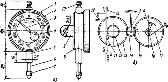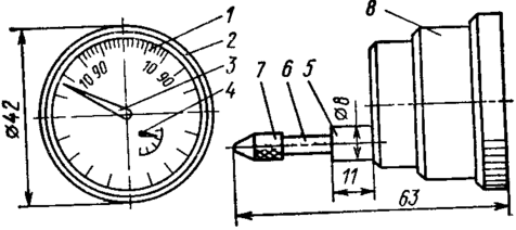 При измерении меру заменяют изделием, и наконечник опускают на его поверхность. Отсчет по шкале индикатора показывает отклонение размера изделия от размера меры в сотых долях миллиметра. При абсолютных измерениях, порядок настройки тот же. Базой для настройки служит поверхность предметного стола стойки или поверочной плиты. По указателю определяют число миллиметров в размере.