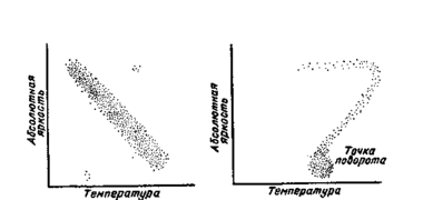 Диаграмма Герцшпрунга — Рессела для молодого скопления (слева) и та же диаграмма для старого скопления (справа); показана точка поворота