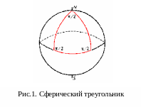 Некоторое представление о свойствах такого пространства можно получить на простейшем примере сферы, поверхности обычного глобуса. Рассмотрим на ней сферический треугольник — фигуру, ограниченную дугами большого радиуса. (Дуга большого радиуса, соединяющая две точки на сфере, — это кратчайшее расстояние между ними: она естественный аналог прямой на плоскости.) Выберем в качестве этих дуг участки меридианов, отличающихся на 90o долготы, и экватора (рис. 1). Сумма углов этого сферического треугольника отнюдь не равна сумме углов π,треугольника на плоскости:
