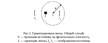 Если, однако, гравитационная линза не лежит на прямой, соединяющей источник с наблюдателем, картина оказывается иной. В случае сферически-симметричной линзы возникают два изображения (рис. 3), одно из которых лежит внутри кольца Эйнштейна, соответствующего осесимметричной картине, а другое — снаружи. Подобные изображения также наблюдались, они выглядят как двойные квазары, как квазары-близнецы.