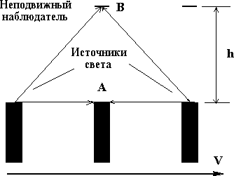 Пусть наблюдатель A находится посередине длинного поезда, движущегося со скоростью сравнимой со скоростью света, а наблюдатель B стоит на земле вблизи железнодорожного полотна. Устройства, находящиеся в хвосте и в голове поезда на одинаковых расстояниях от A, испускают две короткие вспышки света, которые достигают наблюдателей A и B одновременно - в тот момент, когда они поравняются друг с другом. Какие выводы сделают из одновременного прихода к ним световых сигналов наблюдатели в поезде и на земле?