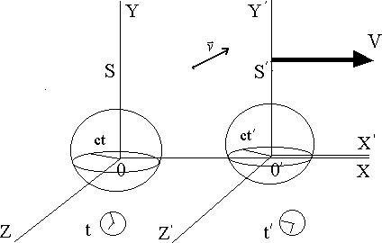 Преобразования Лоренца, обобщающие формулы Галилея перехода от одной инерциальной системы отсчета в другую, можно получить из анализа еще одного мысленного эксперимента. Пусть начала координат систем отсчета S и S в начальный момент t = t совпадают и оси координат в них имеют одинаковую ориентацию (см. Рис. 6). В этот момент времени в их общем начале координат пусть произошла световая вспышка. С точки зрения наблюдателя, находящегося в системе S, в ней распространяется сферическая электромагнитная волна, которая за время t пройдет расстояние r = c t (