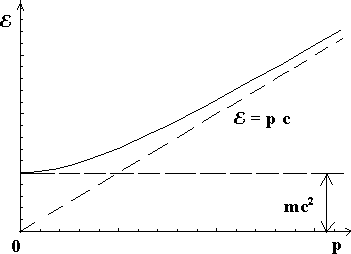 Эта зависимость энергии от импульса изображена на Рис. 10. При малых значениях импульса E = m c2 + p2/2 m, а при достаточно больших импульсах E = p c.