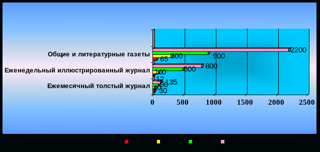 Количество газет и журналов в 1905-1907 гг. стремительно росло и превысило 3300 наименований. Появилась легальная партийная печать. Динамика суммарных разовых тиражей разных типов периодических изданий в период 1860-1914 гг. представлена на диаграмме (рис. 110).