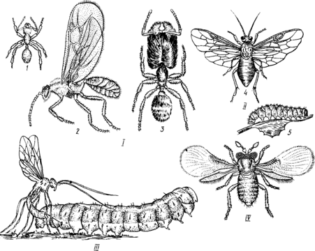/ — муравьи; // — крыжовниковый пилильщик; /// — наездник парализует гусеницу бабочки перед откладкой на нее яиц; IV—яйцеед-трихограмма;