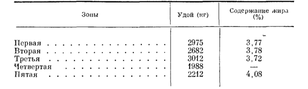 Естественноисторические, климатические и кормовые условия, а также уровень зоотехнической работы в указанных зонах различны. Поэтому симментализированному скоту в них присущи некоторые особенности. Так, у скота Украины отмечаются большие широтные промеры и низконогость. В центральных областях у помесей наблюдается более крепкая конституция, скороспелость и пропорциональность форм. О молочной продуктивности и жирномолочности симментализированного скота по зонам разведения в совхозах, по данным бонитировок за ряд лет, свидетельствует следующая таблица: