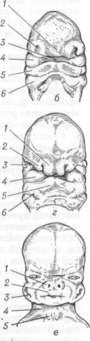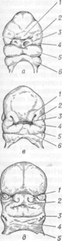 ис. 3. Основные этапы формирования лица в эмбриональном развитии (по В. М. Пэттену): а — эмбрион 4 недель (1 — лобный отросток; 2 — носовая плакода, 3 — ротовая, или глоточная, перепонка, 4 —верхнечелюстной отросток, 5 — манпибулярная дуга, 6 — гиоидная дуга); б — эмбрион 5 недель (1 — лобный отросток, 2 — носовая ямка, 3 — ротовое отверстие, 4 — верхнечелюстной отросток, 5 — мандибулярная дуга, 6 — гиоидная дуга); виг — эмбрионы 5 недель и 6 недель (1 — медиальный носовой отросток,