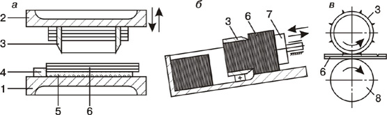 Рис. 2.6. Схемы высечки: а — ножевой резки; б — неподвижным ножом; в — ротационной. 1 — неподвижная плита; 2 — подвижная плита; 3 — фигурный нож; 4 — упор; 5 — марзан; 6 — полуфабрикат; 7 — толкатель; 8 — опорный вал