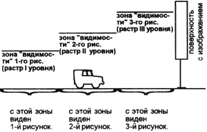 Итак, на одну статичную поверхность можно нанести несколько изображений, которые, при приближении к ним, будут сменять друг друга. Технология приготовления такой поверхости очень простая. Любой рисунок (или фотография) сканируется, увеличивается в соответствующее число раз: получается "растр 1-го уровня". Затем поверх этого растра наносится другой рисунок с меньшим растром (2-го уровня). Также поверх наносится третий рисунок с еще меньшим растром (3 уровень). И т.д.