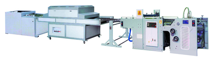 Для нанесения УФ-лака используются обычные трафаретные печатные станки – в зависимости от требуемой производительности полуавтоматические или автоматические. Ручные станки используют редко из-за их низкой производительности и невозможности обеспечения постоянного давления ракеля при печати, в результате чего может получаться слой лака неодинаковой толщины на разных участках оттиска. Полуавтоматические станки можно использовать как в режиме печати с ручным накладом и съемом с ориентировочной производительностью 800 оттисков в час, так и смонтированными в линию, состоящую из печатного станка, подборщика листов и туннельной печи УФ-сушки. При работе на такой линии печатник лишь подает листы запечатываемого материала на печатный стол, а съем производится подборщиком листов, который переносит их на ленту транспортера УФ-печи. Производительность такой линии с учетом скорости работы печатника может составлять до 1000 оттисков в час.