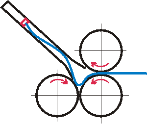 В более простой по конструкции кассетной фальцевальной машине (рис 4) лист постоянно подталкивается вперед. После того, как передний край его упрется в ограничитель, в ограниченном пространстве кассеты листу некуда деваться и он, изгибаясь на месте фальца, вовлекается в промежуток между фальцующими валиками. Положение фальца в обоих механизмах регулируется за счет перемещения ограничителя, а подстройка под толщину бумаги производиться изменением зазора или усилия сжатия валов.