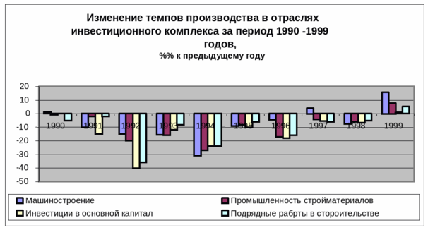 По мере ослабления темпов спада промышленного производства отмечалось и постепенное замедление темпов свертывания инвестиционной деятельности. Этот процесс довольно существенно дифференцировался и по отдельным периодам, и отраслям промышленности. Так, в 1997 году в результате пересмотра налоговых льгот существенно замедлились темпы сокращения инвестиций в производственное строительство. При уменьшении объема инвестиций в основной капитал в целом по экономике на 5,0%, инвестиции в производственное строительство составили 99,0% от уровня предшествующего год. Однако в 1998 году в условиях кризиса в финансовом секторе экономики эта тенденция не сохранилась, и вновь отмечалось резкое сокращение инвестиционной активности. С изменением экономической конъюнктуры в 1999 году в промышленности зафиксирован прирост инвестиций в основной капитал на 8,8% по сравнению с предыдущим годом.