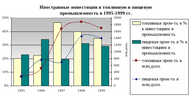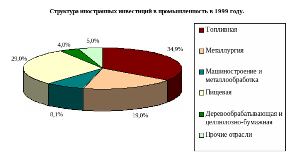 Изменение структуры инвестиций в сферу производства в 1999 году произошло за счет переориентации инвесторов с рынка капиталов на инвестиции в экспортные отрасли России и, прежде всего, в топливную промышленность, а также существенного увеличения вложений в пищевую промышленность. Так, на топливную и пищевую промышленность в 1999 году пришлось 82,7% объема иностранных вложений от прямых инвесторов, направляемых в промышленность.
