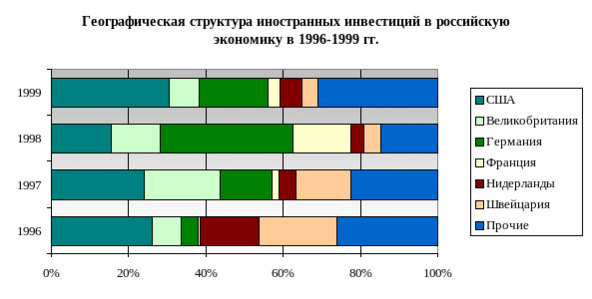 Страновая структура иностранных инвестиций в 1999 году характеризуется снижением уровня концентрации при сохранении лидирующей роли фирм США и сокращении поступлений из Германии. Вслед за США и Германией с долей вдвое меньше следует Великобритания, за ней: Нидерланды, Швейцария и Франция.