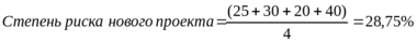 В этом случае степень риска данного инвестиционного проекта может быть определена следующим образом. Если предположить, что направленность деятельности данной фирмы практически во все периоды времени одинакова, то, следовательно, можно сделать и предположение о том, что проекты A, B, C и D, имея некоторые отличия, все же были приблизительно одинаковы с точки зрения воздействия на них различных видов риска. Это обусловлено как сектором, в котором работает данная фирма, так и персоналом работающих на данной фирме. То есть. В наиболее общем виде степень риска нового инвестиционного проекта может быть рассчитана как среднеарифметическое степеней риска предыдущих проекта. Таким образом,