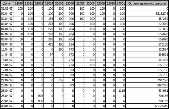 Проанализируем метод на реальных данных. В Приложении 5 приведены последние цена и эффективная доходность, приведенная к месячной с учетом налога с доходов по ценным бумагам и с учетом комиссии биржи с 1 по 30 апреля 1997 по вторичным торгам на рынке РКО. Пусть в начальный момент времени есть консервативный портфель: количество бумаг каждой серии 100 штук(за исключением тех серий, которые размещаются в апреле). Начальная сумма денег = 0. Пусть каждый день может совершается только одна операция продажи-покупки. Придерживаясь предложенного метода получим следующие результаты(см. Таблицу 3) (в ячейках таблицы - количество бумаг на конец дня):