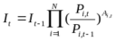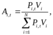 где It - значение индекса на текущую дату; It-1 - значение индекса на предыдущий день; Pi,t - средневзвешенная цена (объем торгов в рублях деленный на объем торгов в штуках) каждого обращающегося выпуска; V - объем эмиссии каждого выпуска в номинальном выражении; Аi,t - весовые коэффициенты; i - номер выпуска, t - день.