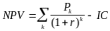 Допустим, делается прогноз, что инвестиция (IC) будет генерировать в течение n лет, годовые доходы в размере P1, P2, ..., Рn. Общая накопленная величина дисконтированных доходов (PV) и чистый приведенный эффект (NPV) соответственно рассчитываются по формулам: