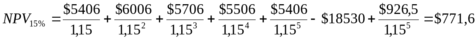 На основании изучения рынка продукции, которая производится на предприятии, установлена возможность увеличения платежеспособного спроса на неё. В связи с этим предприятие рассматривает целесообразность приобретения новой технологической линии для увеличения производства продукции с целью увеличения объема продаж. Оценка возможного увеличения объёма продаж установлена на основании анализа данных о потенциальных возможностях конкурентов. Стоимость линии (капитальные вложения по проекту) составляет $18530; срок эксплуатации - 5 лет; прибыль за вычетом налога на нее от реализации основных фондов по истечении срока их службы составит $926.5;. денежные потоки (прибыль за вычетом налога на нее и амортизационных отчислений от стоимости введенных в действие основных фондов за счет капитальных вложений) прогнозируется по годам в следующих объемах: $5406, $6006, $5706, $5506, $5406. Ставка дисконта для определения теперешней стоимости денежных потоков принята в размере 12% и 15%. Граничная ставка для оценки расчетного уровня внутренней ставки дохода установлена в размере 16%. Приемлемый для предприятия период окупаемости капитальных вложений, исчисленный по данным о денежных потоках и теперешней стоимости денежных потоков принят 5 лет. Целесообразен ли данный проект к реализации?