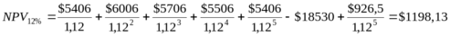 Инвестиции составляют $18530 в 0-й год. Денежный потоки за пятилетний срок составляют: $5406, $6006, $5706, $5506, $5406. Доходы покроют инвестиции на 4 год. За первые 3 года доходы составляют:
