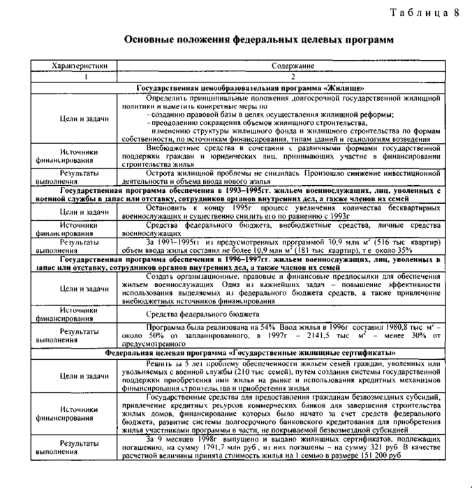 Изменение соотношения источников финансирования не только не уменьшило остроту жилищной проблемы, но и привело к дальнейшему ее возрастанию. В частности, еще более очевидной стала проблема недооценки значимости социальной направленности жилищной реформы. Для ее решения понадобилась разработка дополнительных мер государственной поддержки определенных социальных групп населения, прежде всего малоимущих граждан, молодых и многодетных семей, а также военнослужащих, граждан, уволенных с военной службы в запас или отставку, лиц, проработавших длительное время в районах Крайнего Севера и приравненных к ним местностях, вынужденных переселенцев, граждан, пострадавших в результате аварий и стихийных бедствий. На решение этих задач и был направлен ряд разработанных и утвержденных федеральных целевых программ. Ход и итоги их реализации представлены в табл.8 [116, с. 14].