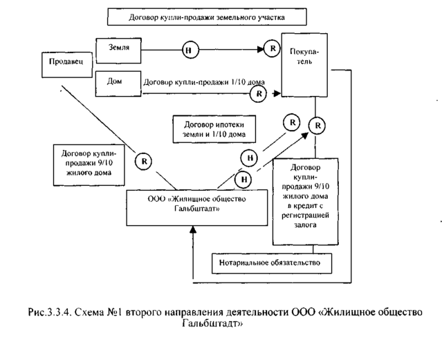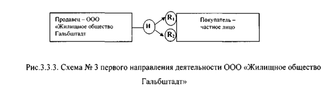 Схема № 1 предусматривает куплю-продажу земли между продавцом и покупателем непосредственно и долевую куплю-продажу жилого дома ООО «Жилищное общество Гальбштадт» и покупателю. Размер долей определяется конкретной платежеспособностью покупателя, но не может быть ниже установленного предела. Например, доля покупателя составляет 1/10, а доля ООО «Жилищное общество Гальбштадт» - 9/10. Каждый оплачивает свою долю из собственных средств.