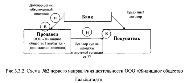 Вместе с тем схема № 1 имеет очевидные объективно-правовые недостатки. Договор ипотеки можно заключить только после возникновения права собственности на жилой дом (п.1 ст.6 ФЗ «Об ипотеке» и абзац 4 п.2 ст. 13 федерального закона № 122-ФЗ от 21 июля 1997г. «О государственной регистрации прав на недвижимое имущество и сделок с ним»). То есть, наблюдается разрыв между моментом заключения и государственной регистрации договора купли-продажи и моментом совершения сделки залога. После оформления права собственности на жилой дом покупатель может всячески уклоняться от заключения договора залога, несмотря на ранее принятые обязательства. Конечно можно понудить покупателя к заключению договора ипотеки в судебном порядке (например, предусмотреть это предварительным договором). Однако заключение такого договора потребует дополнительных расходов на его нотариальное удостоверение. Кроме того, такая схема предполагает, что на заключительном этапе сделки инициативная роль будет принадлежать ООО «Жилищное общество Гальбштадт» при явной незаинтересованности покупателя. Это, в свою очередь, увеличивает объем работы ООО «Жилищное общество Гальбштадт», что представляется нецелесообразным.