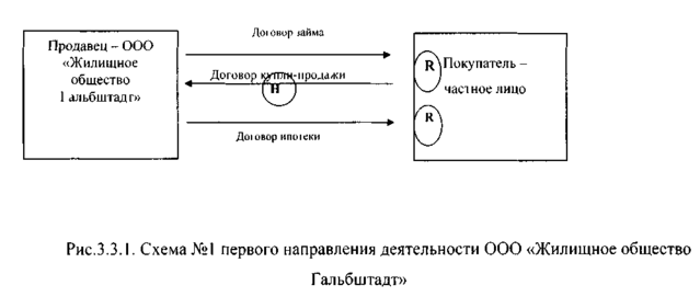 Схема № 1. ООО «Жилищное общество Гальбштадт» предоставляет покупателю целевой заем. Суммой, полученной согласно договору займа, покупатель оплачивает цену недвижимого имущества и приобретает на него право собственности. Затем ООО «Жилищное общество Гальбштадт» в обеспечение договора займа заключает Договор ипотеки, удостоверяемый нотариально, и регистрирует его в учреждении юстиции. Схема предусматривает наличие между ООО «Жилищное общество Гальбштадт» трех договоров и выглядит следующим образом: