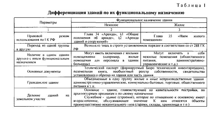Как уже отмечалось, действующее законодательство выделяет ипотеку, т.е. залог недвижимого имущества, в особый объект договорных отношений в связи с гем, что недвижимости присуща неразрывная связь с земельным участком, на котором указанные объекш находятся, и оттого их перемещение технологически невозможно. Проиллюстрируем высказанный тезис на следующем небольшом примере. Так, согласно ГК РФ здания делятся на две взаимоисключающие группы: жилые и нежилые. Основные параметры, имеющие отношение к функциональному назначению нежилых и жилых зданий, представлены в табл.1 [116, с.25]