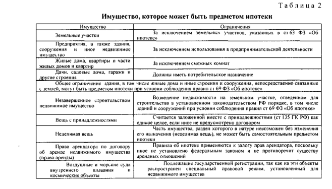 По договору об ипотеке может быть заложено недвижимое имущество, указанное в п.1 ст. 130 ГК РФ, права на которое зарегистрированы в порядке, установленном для государственной регистрации прав на недвижимое имущество. Состав такого рода имущества и выдвжаемые при этом ограничения, в соответствии с положениями ст. 5 ФЗ «Об ипотеке», приведены в табл.2.