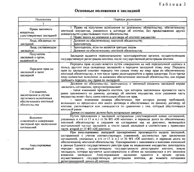 При создании вторичного рынка важнейшей задачей является обеспечение защиты прав не только должника и кредитора в кредитном договоре и договоре залога, но и вторичных инвесторов, т.е. лиц, приобретающих ипотечные ценные бумаги на вторичном рынке. Отечественные законодатели в качестве основы для образования и функционирования вторичного рынка вводят ценную бумагу - закладную (см. ст. 13 гл.111. ФЗ «Об ипотеке»). Основные положения о закладной приведены в табл.3 [106, с.33].