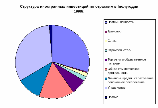 Наиболее привлекательными для иностранных инвесторов, по-прежнему, остаются промышленность, общая коммерческая деятельность по обеспечению функционирования рынка, финансы, кредит, страхование, пенсионное обеспечение, торговля и общественное питание. Доля иностранного капитала, направленного в промышленность России, в общем объеме инвестиций сократилась с 43,3% в 1995г. до 29,4% в I полугодии 1998г.