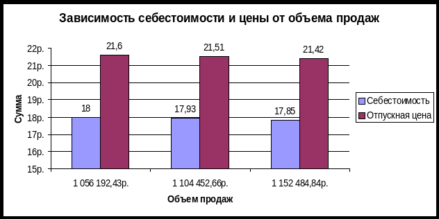 Рис. 2. Зависимость себестоимости и цены от объема продаж.