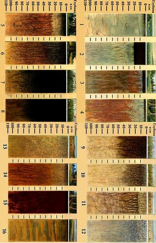 Тундрова глеєвий. 2. Торфяно-болотний. 3. Підзолистий. 4. Дерново-підзолистий. 5. Болотно-подзолистий. 6. Серий лесовий. 7. Чернозем типовий. 8. Лучно-чорноземний. 9. Каштановий. 10. Бурий пустельно-степовий. 11. Солонець. 12. Солончак. 13. Сірозем. 14. Жевтозем. 15. Червонозем. 16. Алювіально-дерновий.